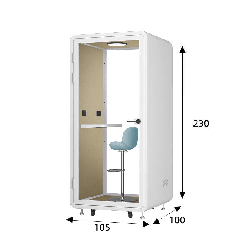 This is portable acoustic phone booth, it is design for user to have private phone call or meeting in an open place such as office space, shopping mall, airport, hotel lobby and exhibition. This soundproof booth is made with durable steel frame, tempered glass door, polyester acoustic sound proofing wall material, ventilation-fan, lighting, power supply and USB socket. This pod has been tested for sound insolation and it is recommended for home, hotel and office.